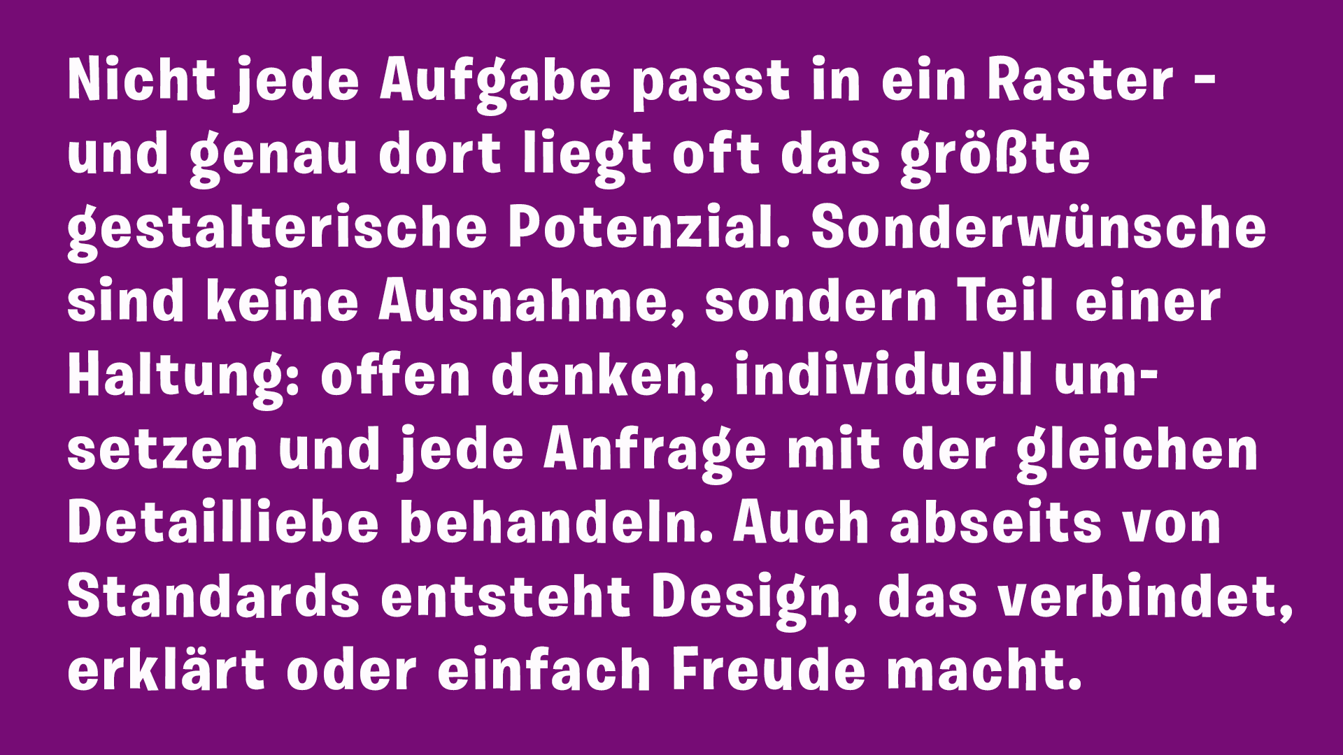 Das Ziel: ein reibungsloser Prozess, bei dem alle Elemente aufeinander abgestimmt sind – inhaltlich, visuell und organisatorisch. Die Ergebnisse werden aus einer Hand geliefert – und auf Wunsch bis vor die »Haustür«. So definiert sich bei graphicsson Zusammenarbeit im Sinne einer zuverlässigen, dienstleistungsorientierten Projektabwicklung.